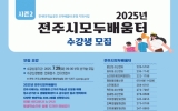 전주시 클릭뉴스2025. 07.29[클릭뉴스]전주시는 시민 누구나 가까운 곳에서 쉽고 편리하게 평생학습을 누릴 수 있도록 운영 중인 ‘전주시 모두배움터 시즌2’ 강좌의 수강생을 선착순 모집한다고 29일 밝혔다. ‘모두배움터’는 ‘언제, 어디서나, 누구나’ 배우는 전세대 평생학습 공간을 지향하는 전주시의 생활밀착형 평생교육 브랜드로, 지역 내 다양한 생활문화센터와 청소년기관, 공유공간 등과 협력해 권역별로 운영된다. 올 하반기 운영되는 모두배움터 시즌2는 전주시민의 근거리 학습권을 더욱 확대하기 위해 청소년부터 장년층까지 전 세대를 아우르는 다채로운 교육과정이 포…