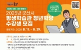 군산시 클릭뉴스2025. 07.29[클릭뉴스]군산시평생학습관이 청년 강사들과 함께 지역사회에 활력을 불어넣는 ‘2025년 청년학당 프로그램’을 오는 8월 11일부터 8월 29일까지 운영한다. 이번 프로그램은 군산시에 거주하며 관련분야 학력 또는 자격 등을 갖추고 사회활동을 준비하는 청년 강사들이 직접 강의를 기획하고 시민이 함께 배우는 학습 공동체를 지향하기 위해 기획됐다. 시는 이번 프로그램을 통해 지역사회와 청년이 함께 성장할 수 있는 선순환 구조를 구축하여 세대와 계층을 아우르는 협업과 소통의 장도 마련될 것으로 기대하고 있다. 운영되는 프로그램은 5개 …