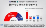 전라남도 클릭뉴스2025. 07.28[클릭뉴스]완주군의회는 28일, 코리아정보리서치 23일부터 24일까지 조사하고, 케이저널이 28일 발표한 완주군민 여론조사 결과를 인용하며 “완주-전주 행정통합에 대한 군민의 명확한 반대 의사를 다시 한번 확인했다”고 밝히고, “군민의 뜻을 철저히 반영하지 않은 일방적 통합 추진은 즉각 중단되어야 한다”고 강력히 촉구했다. 완주군민 1003명이 응답한 해당 여론조사는 완주군민의 65.0%가 전주와의 행정통합에 반대 입장을 나타냈으며, 찬성은 30.7%에 그쳤다. 또한, 97.8%가 행정통합 논의를 인지하고 있는 것으로 나타났으…