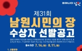 남원시 클릭뉴스2025. 07.16[클릭뉴스]남원시의 명예를 드높이고 지역발전에 헌신한 분들을 위한 최고 영예의 상 제31회 남원시민의 장 후보자를 오는 7월 14일부터 8월11까지 공개 모집(추천) 한다. 남원시민의 장은 다양한 분야에서 우리 시 발전에 기여한 분들을 기리기 위해 총 6개 부문으로 나누어 후보자를 추천 받는다. ▲문화장(교육,예술,언론 등 향토문화 발전에 기여한 분) ▲체육장(남원체육 진흥 및 위상 제고에 기여한 분) ▲효행장(부모를 공경하고 이웃을 사랑하며 미풍양속을 실천하여 주민의 칭송을 받는 분) ▲봉사장(지역사회 봉사활동으로 귀감이 되는…