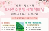 남원시 클릭뉴스2026. 03.31[클릭뉴스]남원시공공도서관(어울림・시립・어린이청소년도서관)에서 ‘제62회 도서관주간’과 ‘세계 책의 날’을 맞아 오는 4월 1일부터 26일까지 공연, 체험, 전시 등 시민들을 위한 다채로운 문화 프로그램을 운영한다. 이번 행사는 도서관의 가치와 중요성을 알리기 위해 한국도서관협회가 지정한 ‘도서관주간(4월 12일~18일)’과 독서 출판 장려와 저작권 보호를 위해 유네스코가 제정한 ‘세계 책의 날(4월 23일)’의 의미를 되새기고자 마련됐다. 남원시는 이 기간을 포함한 26일까지 각 도서관의 특성을 살린 특별한 문화의 장을 선사…