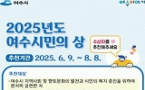 여수시 클릭뉴스2025. 06.09[클릭뉴스]여수시는 오는 8월 8일까지 ‘여수시민의 상’과 ‘자랑스런 여수인’ 후보자 추천을 받는다고 9일 밝혔다. ‘여수시민의 상’은 지역사회와 향토 문화 발전에 이바지하고 시민 복지증진에 현저히 공헌하거나 탁월한 재능으로 시민의 명예를 국내외에 선양한 사람에게 주어지는 상이다. 추천 부문은 ▲지역개발 ▲산업경제 ▲교육과학 ▲문예홍보 ▲사회복지 ▲체육진흥 ▲향토방위 등 7개이다. 후보자는 시장, 시의회의장, 유관기관 단체장, 대학장 및 각급 학교장이 추천할 수 있으며, 주민 50인 이상의 연서가 있는 경우 읍·면·동장도 추천…