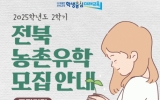 여수시 클릭뉴스2025. 06.04[클릭뉴스]전북특별자치도교육청은 2025학년도 2학기 ‘전북 농어촌유학생’을 모집한다고 4일 밝혔다. 모집 대상은 전북 외 지역 초등학교 1학년부터 중학교 2학년으로 1년 이상 유학 생활이 가능한 경우 신청할 수 있다. 전북교육청은 학생 수 10명 이상 60명 이하의 농어촌 지역 초‧중학교 중 거주시설이 확보된 학교를 모집한 결과 도내 12개 시‧군 47개 학교를 농어촌유학 운영학교로 선정했으며, 이들 학교를 중심으로 2학기 유학생 모집을 추진할 계획이다. 2025학년도 2학기 전북 농어촌유학에 참여하고자 하는 학생…