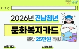 동구 클릭뉴스2026. 02.09[클릭뉴스]광양시는 도내 청년들의 문화 향유 기회 확대와 자기계발을 지원하기 위해 ‘2026년 전남청년 문화복지카드 지원사업’ 신청 접수를 2월 9일부터 실시한다고 밝혔다. 전남청년 문화복지카드 지원사업은 전라남도에 거주하는 청년에게 체크카드 바우처 방식의 문화복지카드를 지급하는 사업으로, 1인당 연 최대 25만 원을 지원한다. 지원 대상은 19세 이상 28세 이하(1998~2007년도 출생자) 청년으로, 신청 개시일 기준 전라남도에 2년 이상 계속 거주하고(2024년 2월 9일 이전부터 도내 거주), 신청일 기준 주민등록상 주…