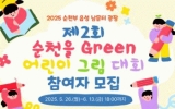 순천시 클릭뉴스2025. 05.26[클릭뉴스](재)순천문화재단은 순천 관내 초등학생 대상으로 ‘제2회 순천을 Green 어린이 그림 대회’를 6월 21일 토요일 오전 10시부터 오후 1시까지 순천부 읍성 남문터 광장에서 개최한다고 밝혔다. 사전접수는 5월 26일부터 6월 13일까지 온라인 접수로 순천시 초등학생 누구나 무료로 신청 가능하다. 본 대회는 순천부 읍성 남문터 광장 활성화 사업 일환으로 순천 어린이들의창의성과 예술적 감수성을 함양하고, 지역사회의 애향심을 고취시키기 위해 (재)순천문화재단에서 2024년을 시작으로 올해로 2회째를 맞이한다. 이번 대…