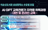 문화 클릭뉴스2025. 05.13[클릭뉴스]여수시이순신도서관에서 오는 15일부터 23일까지 9일간 AI GPT 교육전문가 자격증 취득 과정에 참여할 수강생 40명을 모집한다. 이순신도서관은 교육 전문기관인 (사)미래직업협회와 협업해 오는 11월까지 4차산업 전문지도자 자격증 취득반을 운영, 차세대 미래기술 전문가를 집중 양성하고 있다. 개설 강좌는 ▲메타버스 교육지도사 과정(4월) ▲AI GPT 교육전문가 과정(6월) ▲인공지능 교육지도사 과정(8월) ▲AI코딩 지도사 과정(10월) 등이 있으며, 과정별로 1개월씩 온라인 방식으로 진행된다. AI GPT 교육…