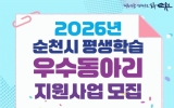 순천시 클릭뉴스2026. 02.05[클릭뉴스]순천시가 지역사회 평생학습 문화 확산을 위해 오는 9일부터 13일까지 ‘2026년 평생학습 우수동아리 지원사업’에 참여할 동아리를 모집한다고 밝혔다. 신청 대상은 공고일 기준 순천시 평생교육 포털에 등록된 학습 동아리로, 구성원이 7명 이상이고, 80% 이상 순천시민이어야 하며, 월 2회 이상 정기적인 활동을 해야 한다. 다만, 친목과 상호 교류 목적의 단순 소모임이나 영리를 목적으로 하거나 동일한 내용으로 다른 행정기관으로부터 보조를 받는 동아리 등은 신청 대상에서 제외된다. 신청 방법은 순천시 평생교육과에 방…
