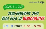 순천시 클릭뉴스2025. 04.30[클릭뉴스]순천시는 2025년도 1월 1일 기준 개별주택가격을 4월 30일 결정·공시하고 5월 29일까지 이의신청을 받는다고 밝혔다. 공시 대상 개별주택은 28,331호로 평균 개별주택가격은 전년대비 2.11% 상승했다. 이는 주택가격 산정의 기초가 되는 표준주택가격의 상승에 따른 것으로 지난 28일 개최된 순천시 부동산가격공시위원회의 심의를 거쳐 최종 결정됐다. 개별주택가격은 시 누리집과 부동산공시가격알리미를 통해 열람할 수 있으며, 가격에 대한 이의가 있는 소유자 및 이해관계인은 이의신청서를 작성하여 5월 29일까지 시청…