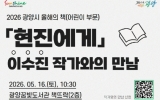 순창군 클릭뉴스2026. 04.22[클릭뉴스] 광양시는 오는 5월 16일 오전 10시 30분 꿈빛도서관에서 ‘2026년 올해의 책’ 어린이 부문 선정 도서'현진에게'의 저자 이수진 작가를 초청해 강연을 연다고 밝혔다. 이번 강연은 시립도서관이 추진하는 ‘시민 한 책 읽기’ 사업의 하나로, 지역 어린이들이 작가와 직접 만나 작품의 주제와 의미를 이해할 수 있도록 마련됐다. 이수진 작가는 화가 이중섭의 삶을 바탕으로 서로에게 손을 내미는 용기를 담은 동화 '현진에게'를 중심으로 ‘차별과 혐오를 넘어서는 다정한 공존’을 주제로 강연을 진행한다. 또한 어린이들이 차…