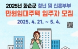 문화 클릭뉴스2025. 04.14[클릭뉴스]화순군은 14일 청년 및 신혼부부를 위한 '2025년『만원 임대주택』 입주 신청자를 4월 21일부터 5월 4일까지 2주간 정부24를 통해 신청·접수한다고 밝혔다. 『만원 임대주택』은 화순군이 지역 아파트를 임대해 신혼부부와 청년들을 대상으로 월 1만 원의 임대료만 받고 재임대하는 사업이다. 사회 초년생인 청년과 신혼부부의 주거비 부담을 줄이고, 정주 여건을 향상하기 위한 주거정책이다. 지난 2년간 총 200호 모집에 총 2,107명의 청년과 신혼부부가 지원하여 2023년 18:1, 2024년 12:1의 높은…