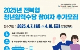 군산시 클릭뉴스2025. 04.09[클릭뉴스]군산시가 미취업 청년들의 활발한 구직활동을 지원하는 ‘2025년 전북형청년활력수당’ 참여자를 4월 18일까지 추가로 모집한다. 본 사업은 청년취업 소요 기간의 장기화로 구직활동에 부담을 느끼는 청년이 늘어나면서 이들을 위해 실질적인 구직활동비를 지원하는 사업이다. 선정 대상자들은 월 50만 원씩 6개월간 총 300만 원을 포인트로 받는다. 이번 사업은 1차 모집공고 당시 선발인원 292명 중 총 305명이 신청하여 모집 인원을 초과할 정도로 호응을 받았다. 그러나 심사 결과 △서류 미제출 △동일유형 사업 중복참…