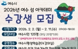 여수시 클릭뉴스2026. 02.02[클릭뉴스]여수시는 여수 섬의 가치와 매력을 알리고 2026여수세계섬박람회의 성공적인 개최를 위한 시민의 관심과 참여도를 높이기 위해 '여수 섬 아카데미'를 운영하고 수강생을 모집한다. '여수 섬 아카데미'는 2월 23일부터 2월 27일까지 5일간 총 5회 과정으로 운영되며 회당 25명씩 총 125명의 수강생을 선발할 예정이다. 신청 기간은 2월 2일부터 2월 11일까지이며 여수시 OK통합예약시스템을 통해 온라인으로 접수할 수 있다. 이번 아카데미는 여수 섬 특화 프로그램인 ‘섬배울학교’와 연계해 추진되는 과정으로 본 과정을 …