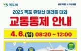 무주군 클릭뉴스2025. 04.02[클릭뉴스]목포시는 유달산봄축제 마지막 날인 6일 목포종합경기장에서 개최되는 2025 목포 유달산 마라톤 대회 코스의 일부 구간에 대해 교통통제를 실시한다고 밝혔다. 안전한 대회 진행을 위해 대회 당일 8시 20분부터 12시까지 코스 구간에 차량통제를 실시한다. 대연초 삼거리에서 압해대교 양방향은 통제되며, 목포종합경기장에서 대양산단 방향은 일방통행이 시행된다. 목포대교 밑, 유달산우체국 ~ 유달산 일주도로, 유달산우체국 ~ 국제여객선터미널 앞까지 전면 통제되며, 구)수협 ~ 대반동 ~ 해상케이블카 등도 부분 통제가 이루…