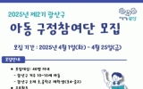 전라북도 클릭뉴스2025. 04.02[클릭뉴스]광주 광산구는 아동의 참여권 보장과 아동 권리증진을 위해 제2기 광산구 아동구정참여단을 25일까지 모집한다고 2일 밝혔다. 아동 구정참여단은 아이들의 눈높이에서 아동 정책에 대해 다양한 의견을 제시하고, 정책에 반영될 수 있도록 구성한 아동 참여기구다. 모집 대상은 광산구에 거주하거나 광산구 소재 학교에 재학 중인 10세∼15세 아동(초4∼중3) 40명을 선발한다. 선발된 아동은 6월 발대식을 시작으로 6개월간 △정책의제 발굴·제안 △어린이 모의의회 체험 △아동권리 교육 및 캠페인 △정책 결의문 발표회 등 다양한 활…