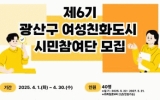 [클릭뉴스]광주 광산구가 제6기 광산구 여성친화도시 시민참여단을 모집한다. 여성친화도시 시민참여단은 성평등 정책 및 생활환경 개선 사업 등 여성친화도시 사업을 추진하고 정책을 제안하는 역할을 한다. 이번 6기는 △교육·워크숍 통한 역량 강화 △일·가정 균형 문화 조성 캠페인 △안전취약지역 발굴 △마을돌봄공동체 및 가족친화환경 조성 사업 홍보 △광산구 여성친화사업 및 정책 홍보 등 다양한 활동을 펼친다. 또한 광산경찰서와 협력해 공중화장실 불법카메라 탐지 및 여성안심귀갓길 점검 등 안전 모니터링과 성범죄 취약 지역을 집중 점검하…