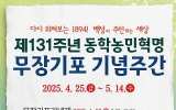 고창군 클릭뉴스2025. 03.26[클릭뉴스]고창군이 제131주년 동학농민혁명 무장기포를 기념하기 위해 기념주간(4월25일~5월14일)을 운영한다고 25일 밝혔다. 동학농민혁명 기념주간은 보국안민을 천명하는 ‘포고문’ 발표와 함께 ‘무장기포’의 역사적 의미를 되새기고, 국민적 공감대를 확산하기 위해 마련됐다. 무장기포 기념제, 동학 진격로 걷기 챌린지, 동학농민혁명 총체극 공연, 동학 특강, 무장 읍성 축제 등 다채로운 프로그램이 진행될 예정이다. 먼저, 4월25일 공음면 무장기포지에서 열리는 기념제에서는 동학농민군의 정신을 기리는 공식 행사와 태권유랑단 …