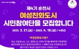 순천시 클릭뉴스2025. 03.25[클릭뉴스]순천시는 건강하고 행복한 여성친화도시 조성을 위해 ‘제4기 여성친화도시 시민참여단’을 4월 18일까지 모집한다고 밝혔다. 시민참여단은 ‘여성친화도시 순천’을 목표로 시민이 주체가 되어 운영되며, 여성친화도시 추진사업에 대한 홍보 및 의견수렴, 양성평등마을 공모사업 등을 통해 성평등 문화 확산 및 도심 안전 모니터링, 생활 불편사항 개선 건의 등의 역할을 수행할 예정이다. 임기는 2년으로 순천시에 거주하는 만 19세 이상 시민이면 누구나 지원할 수 있다. 모집인원은 50명으로 성별, 연령, 활동경력 등을 고려해 다양…