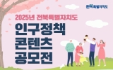 광양시 클릭뉴스2025. 03.24[클릭뉴스]전북특별자치도가 인구 문제 해결을 위한 도민 참여 확대와 전북형 저출생 정책 홍보 강화를 위해 ‘2025년 전북특별자치도 인구정책 콘텐츠 공모전’을 개최한다. 이번 공모전은 숏폼 영상(30~60초)과 그래픽 디자인(포스터·웹 배너) 부문으로 나뉘어 진행되며, 전북 도민이라면 개인 또는 팀 단위로 누구나 참여 가능하다. 출품작은 전북형 저출생 정책의 주요 사업을 소개하거나, 정책이 도민의 실제 삶에 가져온 변화를 효과적으로 표현하는 방식으로 제작하면 된다. 전북자치도는 창의성과 활용성을 기준으로 총 8개 작품을 선정…