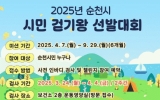 순천시 클릭뉴스2025. 03.21[클릭뉴스]순천시는 생활 속 걷기를 활성화하기 위해 4월부터 9월까지 6개월 동안 모바일 걷기 앱 워크온을 활용한 ‘시민 걷기왕 선발대회’를 진행한다고 밝혔다. 이번 대회에서는 100명의 걷기왕을 선정할 예정이며, 선정 기준은 1일 만보 제한으로 매월 10일 이상 걷고, 6개월 동안 120만보 이상 걷기와 함께 체지방 3kg 이상 감소하는 것이다. 선정된 시민에게는 순천사랑상품권 3만원이 지급된다. 참여를 원하는 시민은 핸드폰 앱인 워크온에서 순천시 커뮤니티에 가입하고, 3월 24일부터 4월 4일까지 보건소 2층 운동영양실…