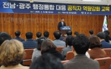 여수시 클릭뉴스2026. 03.09[클릭뉴스]전라남도와 광주광역시의 행정통합이 법제화되며 ‘호남권 메가시티’ 실현이 가시화되는 가운데, 목포시가 통합 이후 지역의 미래 청사진을 마련하기 위한 선제적 대응에 나섰다. 시는 지난 9일 시청 회의실에서 전 직원을 대상으로 '전남·광주 행정통합 대응 공직자 역량강화 교육'을 실시했다. 이번 교육은 지난 3월 5일 국회 의결을 거쳐 공포된 '전남광주통합특별시 설치를 위한 특별법'에 따라 오는 7월 통합특별시 출범을 목표로 추진되고 있는 행정통합에 체계적으로 대비하기 위해 마련됐다. 이날 교육은 전남연구원 김대성 상생협력단…