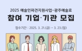 전라남도 클릭뉴스2025. 03.18[클릭뉴스] 광주문화재단은 2025년 ‘예술인파견지원-광주예술로’에 참여할 기업·기관과 예술인을 공개 모집한다. 한국예술인복지재단이 주최하고 문화체육관광부가 후원하는 ‘예술인파견지원-광주예술로’ 사업은 예술인과 기업·기관의 협업을 통해 예술인의 직업 안정화와 예술적·사회적 가치 확산을 목적으로 하는 사업이다. 올해 광주문화재단은 기업․기관 8개소, 예술인 40명(리더예술인 8명, 참여예술인 32명)을 선정해 지원할 계획이다. 전문가 심의를 거쳐 선발된 기업․기관과 예술인은 매칭을 통해 8개의 팀(1팀당 기업·기관 1개소,…
