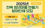 전라북도 클릭뉴스2025. 03.14[클릭뉴스]전북특별자치도가 지역에 활력을 불어넣고 청년들의 안정적인 정착을 지원하기 위해 ‘2025 전북 청년마을 만들기 사업’에 참여할 청년단체를 오는 3월 17일부터 4월 4일까지 모집한다고 밝혔다. ‘전북 청년마을 만들기 사업’은 청년들이 지역사회와 협력해 지속 가능한 청년마을을 조성하는 사업으로, 지역 특성을 반영한 상생 프로그램 운영, 지역 교류·협력 활동 등을 지원한다. 올해는 5개 청년마을을 선정해 개소당 1억 원을 지원할 계획이다. 신청 대상은 전북에서 활동하는 5인 이상으로 구성된 청년단체 또는 기업으로, 대표자…