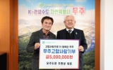 임실군 클릭뉴스2025. 03.13[클릭뉴스]대전광역시 유주도장(도료 도매업) 주현성 대표가 지난 13일 무주군에 1천만 원을 기탁했다. 고향사랑 기부금으로 5백만 원, 장학금으로 5백만 원을 기탁한 주 대표는 “지금은 타향에 살고 있지만 그래도 나고 자란 고향을 잊은 적이 없다”라며 “그래서 내 고향 무주가 지금보다 발전했으면 하는 바람, 이를 이뤄낼 미래 주역들이 잘 자라줬으면 하는 마음을 담아서 고향사랑기부금과 장학금을 전달하게 됐다”라고 전했다. 무주에서 고등학교를 졸업한 주현성 대표는 지난 ‘22년도에도 (재)무주군교육발전장학재단에 장학금 1천만 원…
