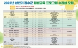 장수군 클릭뉴스2025. 03.12[클릭뉴스]장수군이 군민들에게 평생학습의 기회를 제공하기 위해 오는 14일부터 20일까지 ‘2025년 상반기 평생교육 프로그램’ 수강생을 모집한다고 밝혔다. 모집 분야는 △컴퓨터교실(엑셀기초) △보컬 레코드 △수제간식 만들기 △필라테스 △영어교실 △ 동양인문학 △글라스아트 △라인댄스 △캔들공예 △향수공예 △목공예 △어반스케치 등 12개 프로그램으로 총 193명의 수강생을 모집한다. 각 과정 당 인원은 6~15명 내외이며 군민회관, 장수군귀농귀촌종합지원센터, 장계국민체육센터, 번암면 종합복지회관 등 10개소에서 진행된다. …