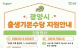 광양시 클릭뉴스2025. 03.11[클릭뉴스]전라남도와 광양시가 올해부터 출생기본수당을 매월 20만 원씩 지원한다. 광양시 출생기본수당은 출생률 반등과 양육에 대한 경제적 부담 경감을 위해 추진하는 사업으로, 1~18세까지 18년간 예산의 범위 내에서 지원할 계획이다. 2024년 1월 1일 이후 출생아 중 전라남도에 출생 신고를 하고 아동과 보호자 중 1명 이상이 광양시에 주소를 두고 거주해야 지원을 받을 수 있으,며 다른 보호자 1명도 전라남도 내에 주소를 두고 있어야 한다. 지원금은 전라남도와 광양시가 각각 10만 원을 부담하며 매월 20만 원이 대상자에…