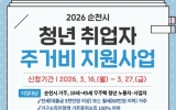 순천시 클릭뉴스2026. 03.17[클릭뉴스] 순천시는 성실히 일하는 청년의 주거 안정과 경제적 자립 기반 마련을 위해'청년 취업자 주거비 지원사업' 대상자를 오는 27일까지 모집한다. 청년 취업자 주거비 지원사업은 도비가 포함된 사업으로, 전·월세 주택에 거주하는 청년에게 최대 12개월간 월 20만 원씩 지원해 주거비 부담을 덜고 지역 정착을 돕는 사업이다. 시는 2019년 사업 시행 이후 현재까지 관내 청년 636명에게 약 9억 7천만 원을 지원해 왔다. 올해 모집인원은 93명이며, 자격요건을 모두 충족한 신청자 중에서 기준중위소득 대비 가구소득인정액 비…