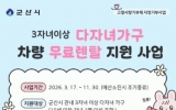 김제시 클릭뉴스2026. 03.16[클릭뉴스]군산시가 3자녀 이상 다자녀 가구의 이동 편의를 돕고 가족 단위 여가 활동을 장려하기 위해 '3자녀 이상 다자녀 가구 차량 무료 렌탈 지원 사업'을 17일부터 본격 시행한다고 밝혔다. 이번 사업은 아이 키우기 좋은 환경을 조성하기 위한 군산시 인구 정책의 일환으로, 군산을 응원하는 마음이 모인 고향사랑기부제 지정기부금으로 추진되어 그 의미를 더했다. 시는 이를 통해 다자녀 가구의 경제적 부담을 덜고, 가족과 함께하는 소중한 시간을 지원하고자 한다. 지원 대상은 공고일 기준 ▲부 또는 모와 세 명 이상의 자녀가 군산…