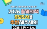 임실군 클릭뉴스2026. 01.22[클릭뉴스]광주 동구는 한 해 동안 시민과 함께 읽을 2026년 ‘책 읽는 동구 올해의 책’ 선정을 위해 후보 도서 추천을 오는 2월 6일까지 접수한다고 밝혔다. ‘올해의 책’ 사업은 지난 2020년부터 인문도시를 지향해 온 동구가 꾸준히 추진해 온 사회적 독서 운동이다. 시민이 직접 추천하고 선정한 책을 중심으로 ▲구민도서지원 ▲작가 초청 행사 ▲독서공모전 ▲독서토론마당 등 다양한 독서문화 프로그램을 운영하며 지역 독서문화 확산에 기여해 왔다. 동구는 지난 6년간 도서 선정 단계부터 시민들의 문제의식과 삶의 경험을 자연스럽게 …