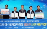군산시 클릭뉴스2026. 01.21[클릭뉴스](재)2026여수세계섬박람회조직위원회는 지난 20일 서울 종로구 HW컨벤션센터에서 광주전남시도민회와 ‘2026여수세계섬박람회 입장권 5,000매 구매약정’을 체결했다고 밝혔다. 이날 약정식은 조직위원장 김영록 전남도지사와 광주전남시도민회 양광용 회장을 비롯해 향우임원 600여 명이 참석한 가운데 진행됐다. 이번 구매약정은 지난해 체결한 조직위와 광주전남시도민회 간 업무협약에 따른 결실로, 협약 이후 실제 참여와 실천으로 이어진 대규모 구매 사례다. 광주전남시도민회는 1955년 출범한 국내 최대 규모의 향우단체로, 광…