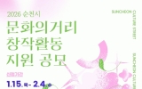순천시 클릭뉴스2026. 01.15[클릭뉴스]순천시는 문화의 거리를 예술특화 거점지역으로 육성하고 지역 예술인의 지속가능한 창작활동을 지원하기 위해 ‘2026년 순천시 문화의 거리 창작활동 지원사업’ 참여자를 공개 모집한다고 밝혔다. 공모 대상은 문화의 거리 구역인 영동․행동 전역과 금곡동 일부 지역에서 문화예술 업종을 운영하거나 거주 중인 주민이다. 지원 분야는 체험, 전시, 공연 등 문화예술 관련 프로그램으로, 지원규모는 체험 최대 200만 원, 전시 400만 원, 공연 500만 원 이내이다. 신청 기간은 1월 15일부터 2월 4일까지이며, 신청 방법과 …