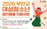 부안군 클릭뉴스2026. 01.14[클릭뉴스]부안군은 여성청소년의 건강한 성장을 위해 부안군 생리용품 지원사업 조례를 제정해 지난 2022년부터 여성청소년 생리용품 지원사업을 지속적으로 추진하고 있다고 밝혔다. 지원대상은 소득수준과 관계없이 부안군에 주소를 둔 11세부터 18세까지의 여성청소년으로, 2026년 기준 2008년 1월 1일~2015년 12월 31일 사이 출생자이다. 단, 다른 법령에 근거해 생리용품을 지원받는 대상자는 중복으로 신청할 수 없다. 신청은 청소년 주소지 읍·면사무소에서 청소년 본인 또는 주양육자가 방문해 1월 12일부터 12월 11일…