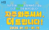 고흥군 클릭뉴스2026. 01.12[클릭뉴스]고흥군이 운영하는 공식 온라인 쇼핑몰 고흥몰이 오는 1월 12일부터 15일까지 4일간, 단골 고객을 대상으로 특별 기획전 ‘자주 와주셔서, 더 드립니다’를 진행한다. 이번 기획전은 2025년 연간 최대 매출 달성을 기념하고, 그 성과에 기여한 구매 고객에게 감사의 뜻을 전하기 위해 마련됐다. 2025년 한 해 고흥몰 주문 횟수를 기준으로 고객별 차등 할인 혜택을 제공하는 것이 특징으로, 고흥몰을 꾸준히 이용해 온 단골 고객일수록 더 큰 혜택을 받을 수 있도록 설계된 고객 감사형 프로모션이다. 행사 기간 고객은 주문 이…