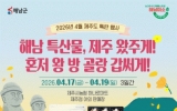 해남군 클릭뉴스2026. 04.17[클릭뉴스]해남군은 바다 건너 제주 소비자를 찾아 오는 17일부터 19일, 3일간 제주시농협 하나로마트 제주점 야외특설매장에서 농수특산물 직거래장터를 운영한다. 이번 행사에서는 해남고구마를 비롯해 잡곡류, 차류, 가공식품 등 100여종의 다양한 농수특산물을 합리적인 가격으로 선보일 예정이다. 특히 이번 행사에서는 소비자 참여를 높이기 위한 다양한 이벤트도 함께 마련됐다. 행사 기간 동안 5만원 이상 구매 고객에게는 해남 특산물을 증정하며, 10만원 이상 구매 고객에게는 1+1 해남 특산물 추가 증정 혜택을 제공한다. 또한 해남군 …