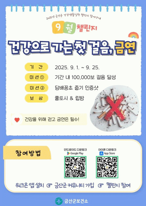 | 금산군보건소, 건강생활실천 9월 챌린지 ‘건강으로 가는 첫걸음, 금연’ 진행
