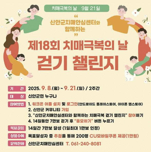 | 신안군, '치매극복 걷기 챌린지'로 치매 예방 앞장! 9월 21일 치매극복의 날 맞아, 군민 건강 증진과 치매 친화 사회 조성 도모 클릭뉴스 pkc0070@naver.com |
