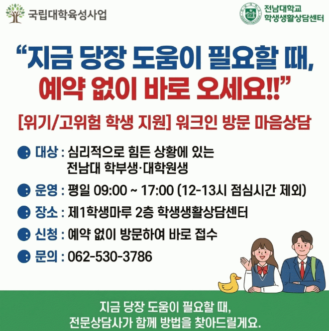 | 전남대, 심리 위기 ‘즉시 대응’ 체계 가동 예약 없이 바로 상담…워크인 시스템으로 위기 대응 골든타임 확보 클릭뉴스 pkc0070@naver.com |